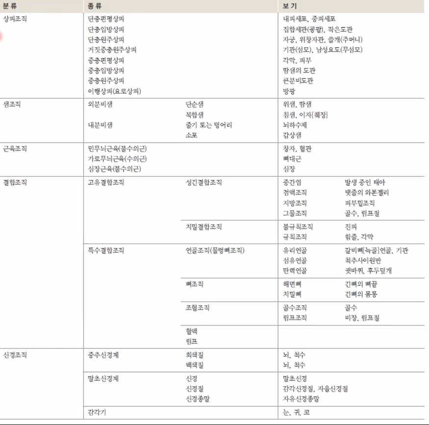 샘조직은 대부분 상피조직 안으로 들어가고 크게는 상피조직, 근육조직, 결합조직, 신경조직 4개로 분류가 된다. 공기와 맞닿는 부분은 전부 상피조직이라고 보면 된다. 결합조직은 organ의 모양이나 기능을 잘 수행할 수 있도록 돕는다. 뼈, 연골등이 여기에 해당된다.