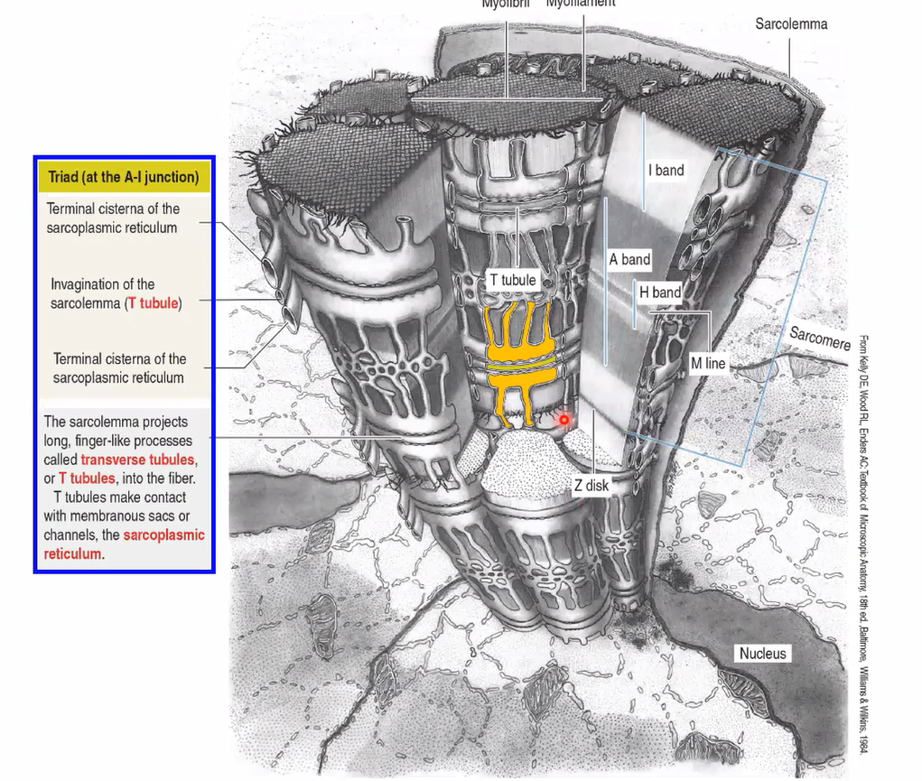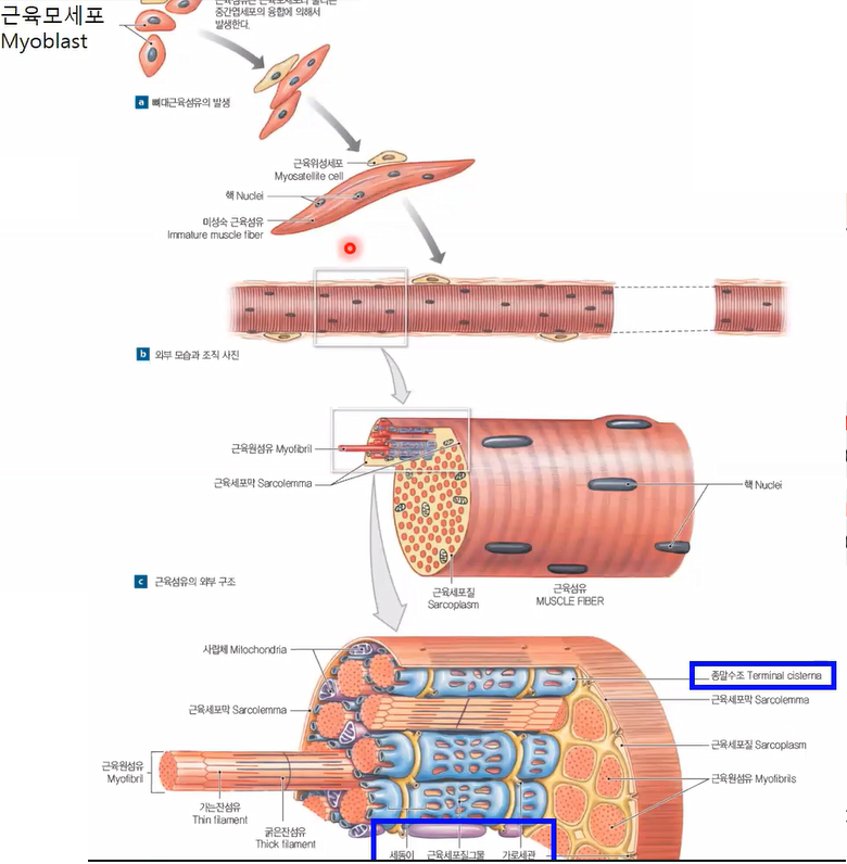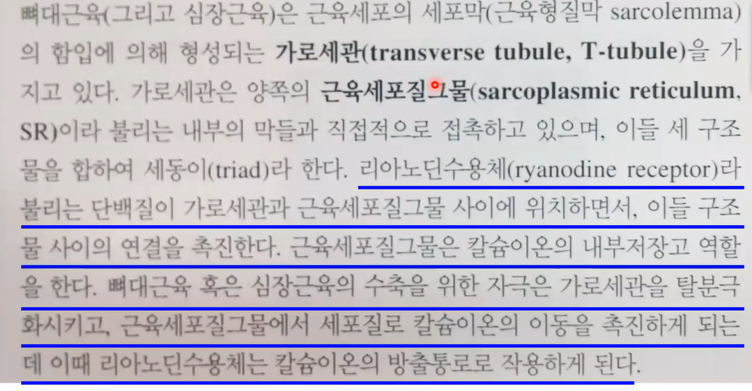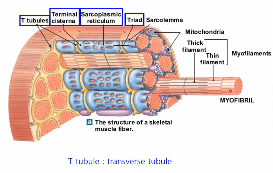 파란색 부분 sarcoplasmic reticulum은 ER(endoplasmic reticulum)과 비슷한 개념인데 칼슘 이온을 저장하는 부분이다. 노란 t tubule이 보이는데 이는 A밴드 경계선에 있다. cisterna라는 개념이 보이는데 tubule 옆에 있는 sarcoplasmic reticulum의 마지막 부분이다.