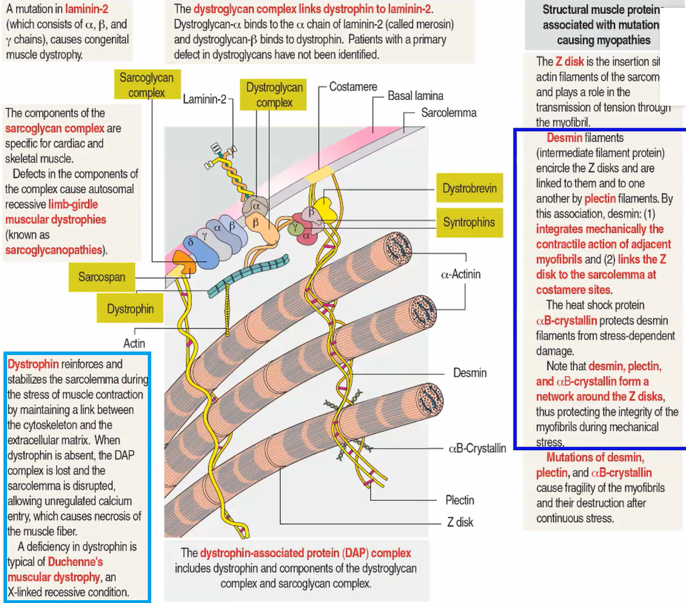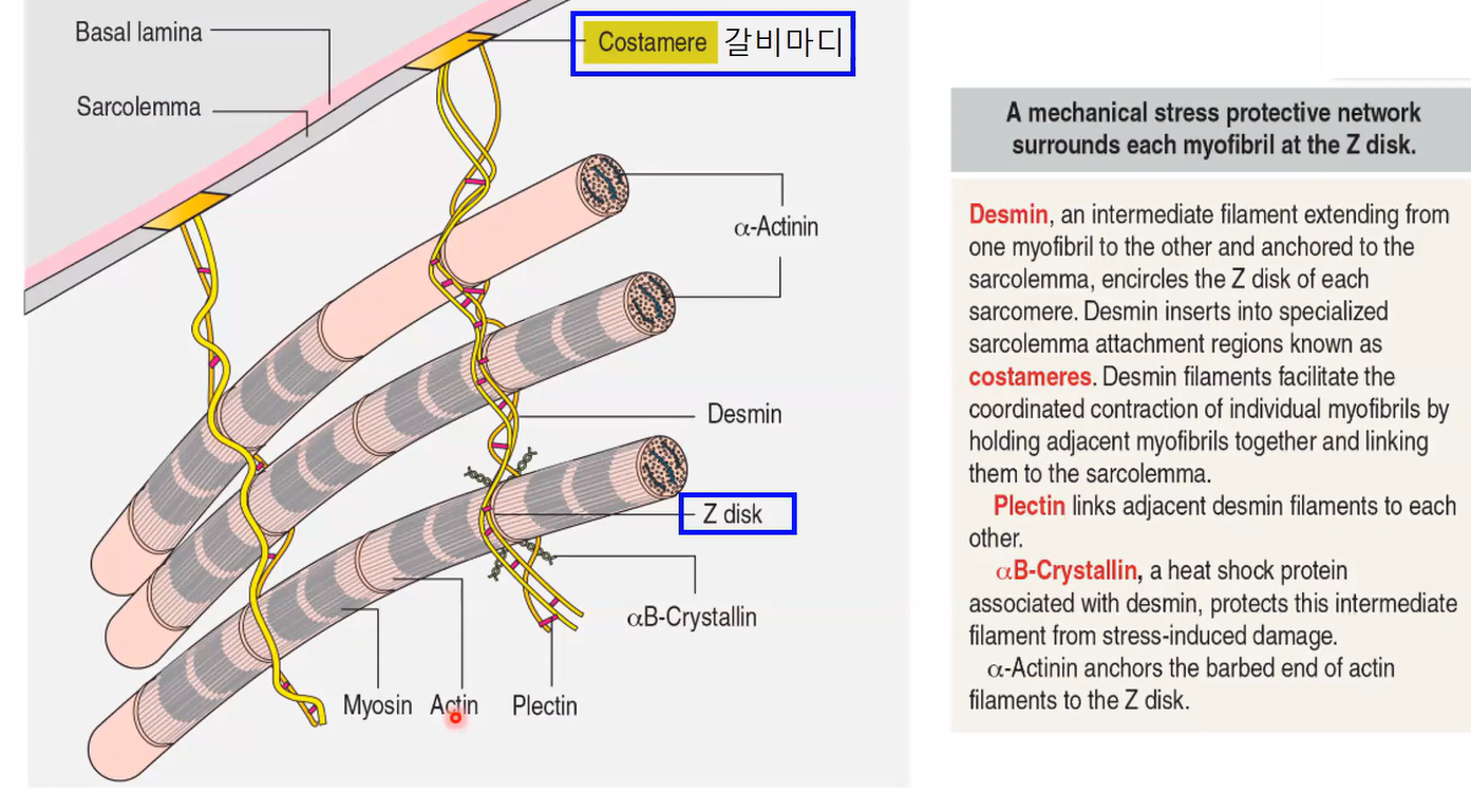 Desmin은 필라멘트를 한번 꼬아주는데 Costamere에 결합한다. 이 부분에 그림처럼 수많은 기능체들이 결합하기 때문에 desmin이 없으면 치명적이다. costamere는 Z disk를 묶어주는데 역할을 하기도 한다. (아래 그림 참고)