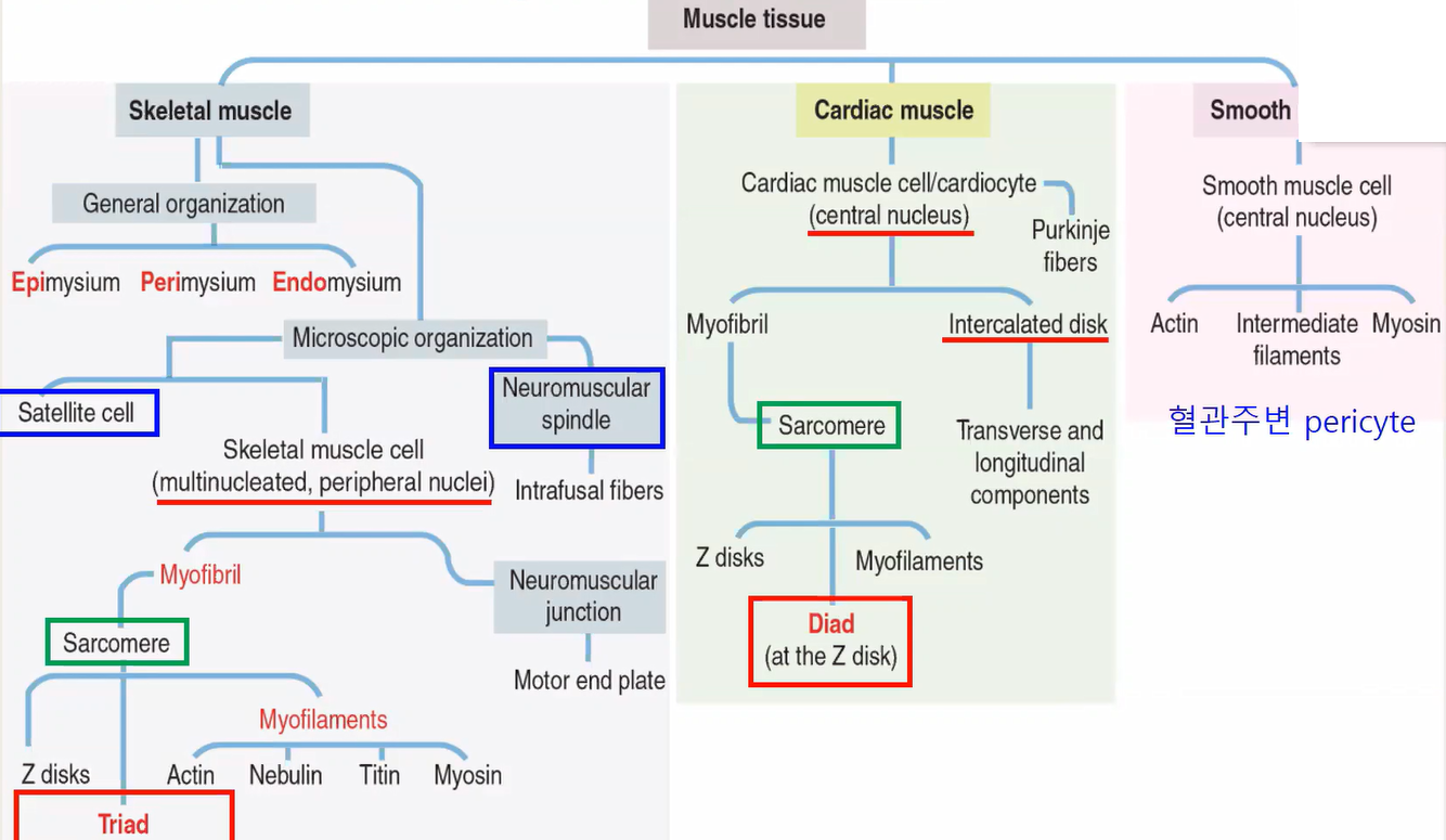 skeletal muscle의 epimysium, perimysium, endomysium은 근막을 이야기하다. satellite cell이 중요한데 똑같은 개념으로 ganglion쪽에서 신경체를 둘러싸고있는 세포도 satellite cell이다. 이름 자체가 위성세포라서 가쪽에 위치한다. 근육과 근육 사이에 위치하여 근육조직이 손상당할때 분화되는 stem cell 역할을 한다고 알려져있다. neuromuscular junction은 신경 자극에 의해서 팔이 움직이는 역할을 하는 곳이다. di/triad는 바깥쪽에서 시그널이 오면 근육을 움직이는 칼슘의 움직임 통로라고 생각하면 된다. 기본적으로 tubule인데 그 위치가 skeletal과 cardiac이 다르다. diad는 z disk 바로 안쪽에 있고 triad는 a 밴드가 끝나는 부분에 걸쳐있다. (아래 그림 참고)