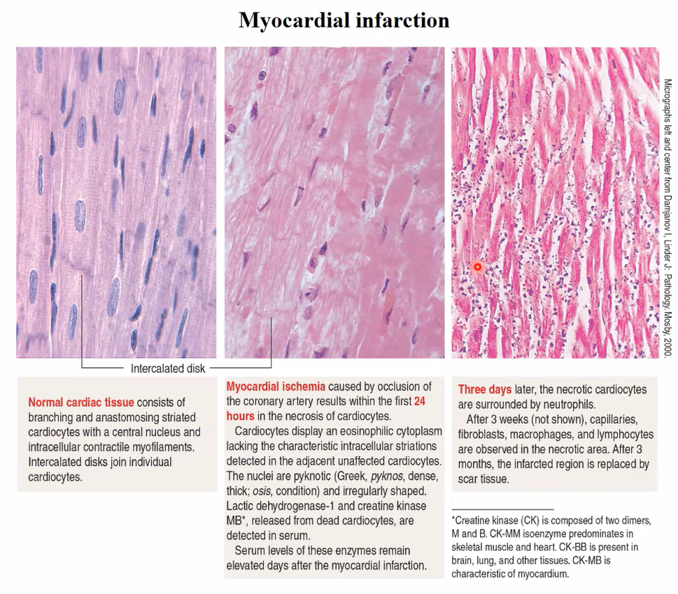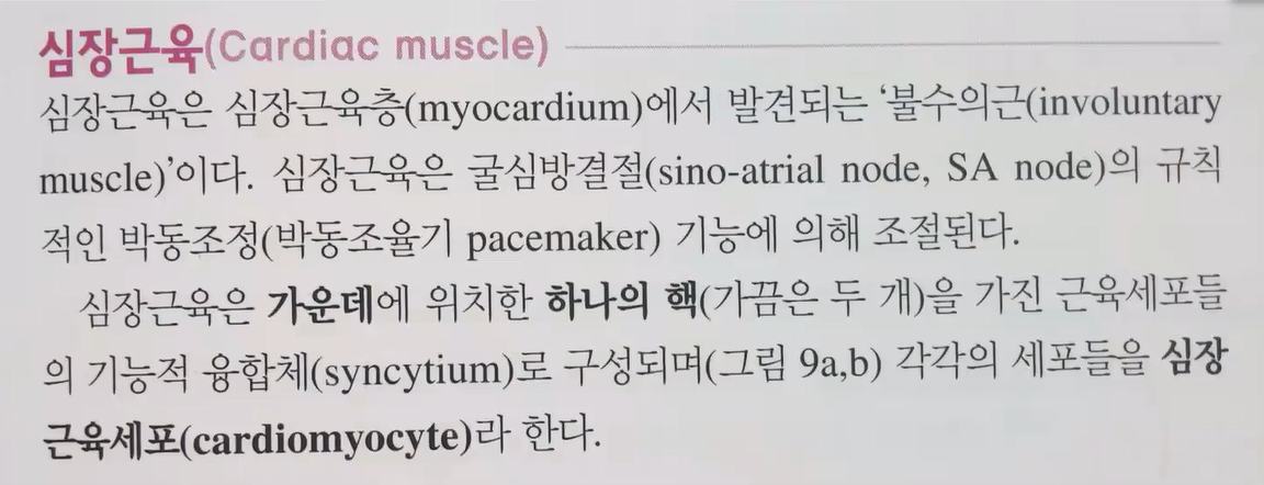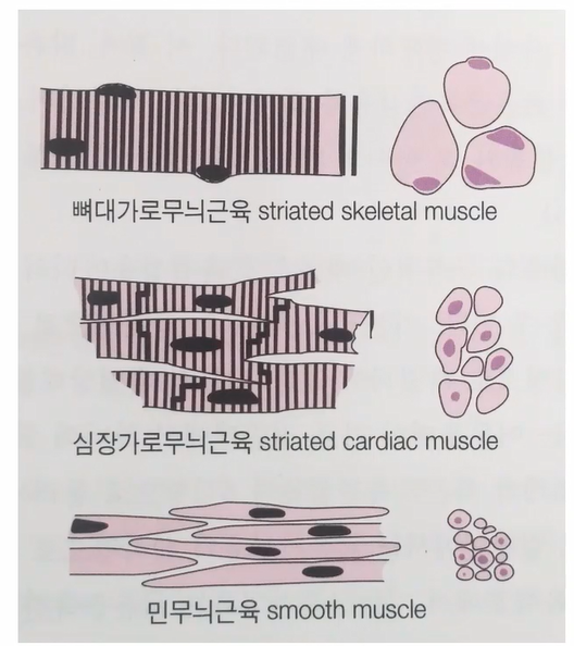 근육은 크게 3가지로 나뉜다. skeletal, cardiac, smooth. 그림을 보면 skeletal은 대체로 다핵세포이고 핵이 가쪽으로 치우쳐져있다(검은덩어리). cardiac muscle은 mononucleated(대부분) or binucleated일 수 있지만 세포가 지그재그로 되어있고 핵이 가쪽보다는 비교적 안쪽에 위치하게 된다. 민무늬근육은 둘과 다르게 무늬가 없는것만으로 구분이 가능하다.