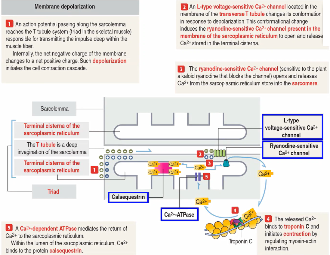 아세틸콜린 분비를 받으면 세포막전위가 플러스로 바뀌면서 voltage gated channel이 열린다. 이러한 기전이 일어나는 곳이 reticulum쪽이기 때문에 칼슘을 많이 가지고 있다. 여기서 sarcoplasmic region으로 칼슘이온을 분비한다. 그곳에 필라멘트들이 있는데 근육을 수축하는데 사용하고 그 이후 다시 reticulum안으로 들어온다. Calsequestrin은 칼슘이온을 바인딩시켰다가 신호를 전달받으면 release시켜서 'Ryanodine-sensitive Ca2+ channel'을 통해 분비된다. 이 채널은 아주 중요하다. 이 채널이 위치한 곳은 sarcoplasmic reticulum이다. 세포 막에 있는 것은 아니다. 다시 칼슘이온을 들여올때는 Ca2+ATPase를 사용한다.
