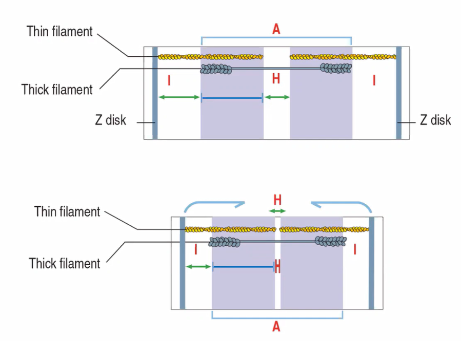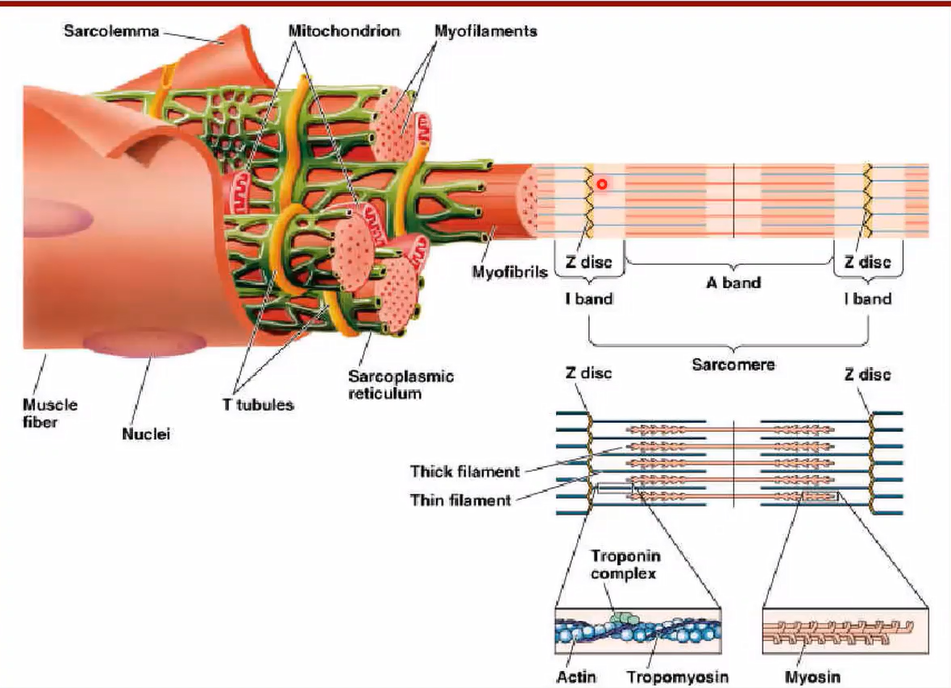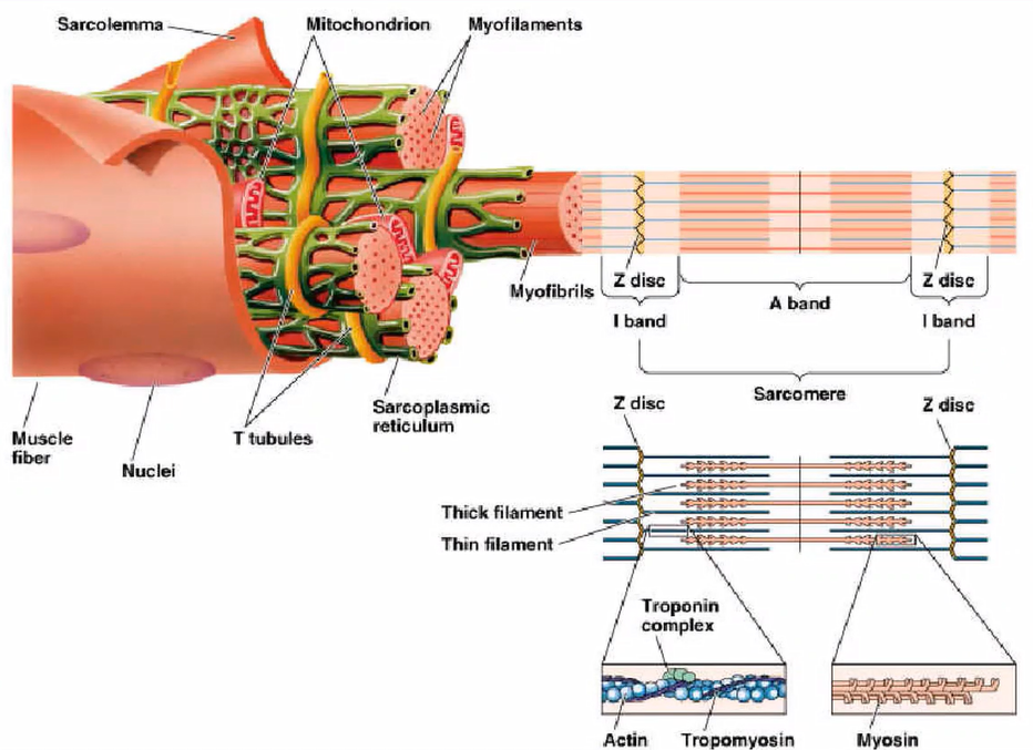 위의 그림은 근육의 구조를 세포단계부터 순차적으로 보여주는다. 맨 아래의 그림을 자세히 나타내면 아래 그림처럼 된다.