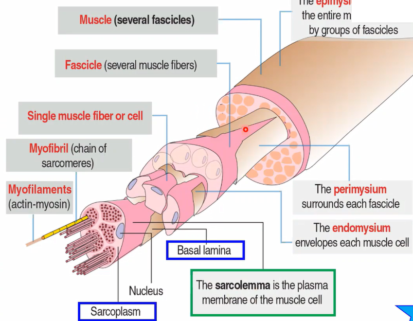 근육바깥막 epimysium이 감싸는 부분 안에 또 근육다발을 감싸는 부분이 있는데 그 부분을 근육다발막 perimysium이라 한다. 또 그 안에 근육섬유를 감싸는 부분은 근육섬유막 endomysium이다.