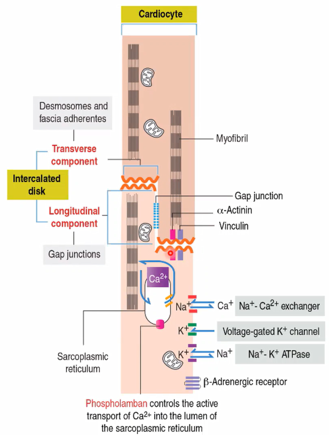 심장근육에도 sarcoplasmic reticulum이 있는데 phospholamban(PLN or PLB)가 부착되어있다. 여기서 ATP를 써서 phosphorylation 여부에 따라 channel의 여닫이 여부가 결정된다 (PLN이 인산화되어야 SERCA2a가 작동하여 칼슘이온을 들여온다). SERCA2a와 PLN이 칼슘이온을 reticulum안으로 들이는 역할을 한다. 그림에는 RyR1으로 적혀있는데 cardiac muscle에서는 RyR2이다.