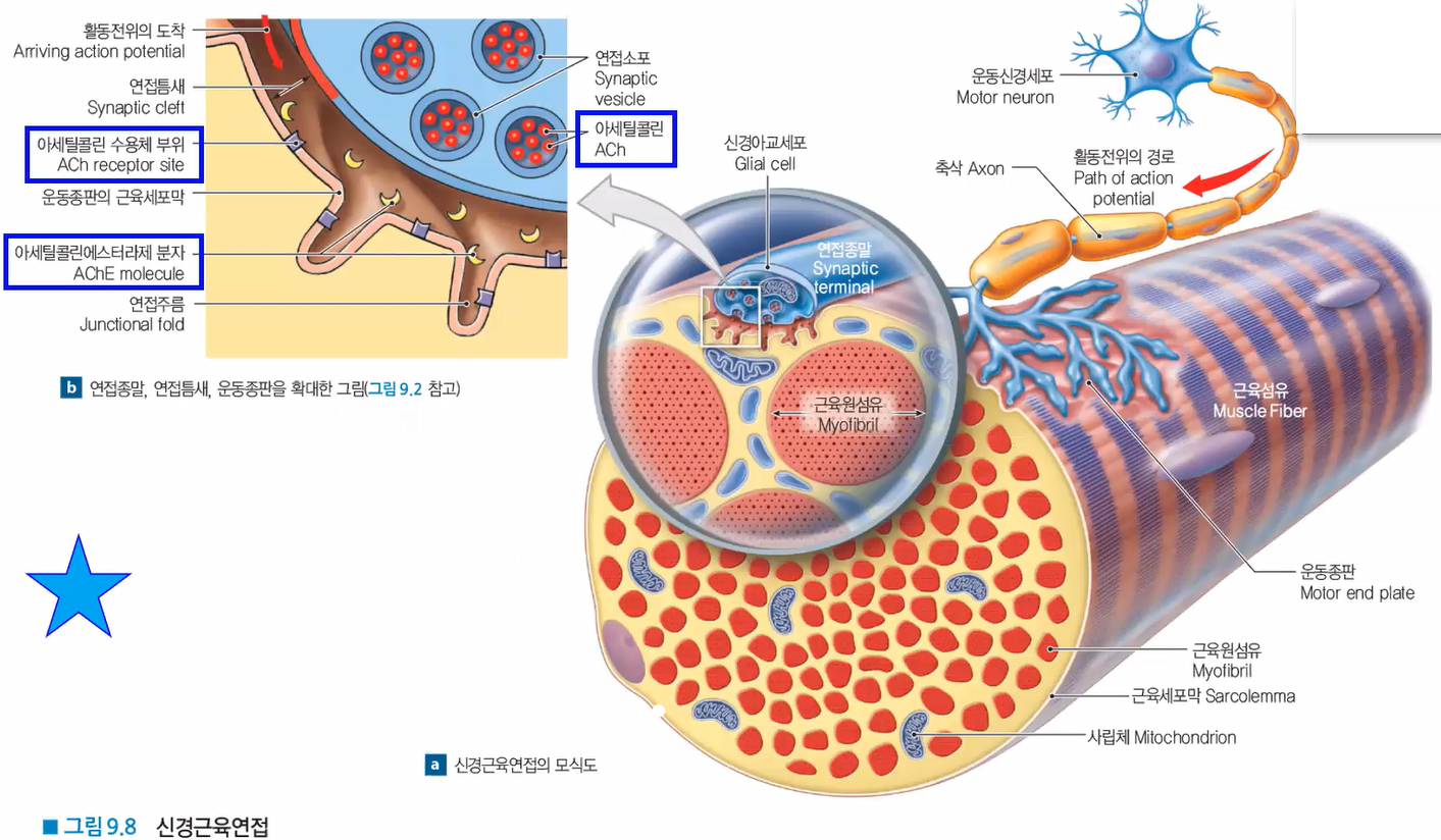 여기서 중요한 것은 neuromuscular junction에 아세틸콜린이 분비된다는 것이다.