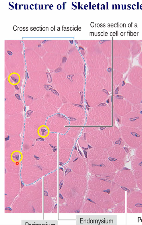 노란색으로 동그라미 친 부분은 막 바깥에 위치한 위성세포다. 그리고 sarcolemma와 endomysium은 다른 개념이다.