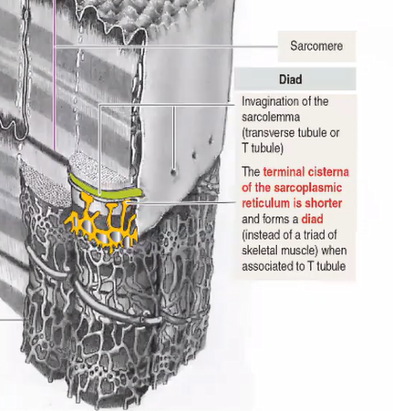t tubule 위아래로 관이 있어서 triad이다. 이 경우엔 방향성이 없지만 심장 근육에서 diad는 방향성이 있다. 즉 자극 전달 방향이 skeletal muscle은 양옆이라면 cardiac muscle은 한쪽으로만 전달된다.