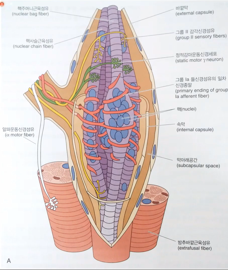 위 사진은 근육방추 (muscle spindle)의 구성요소를 보여주는 모식도이다. 근육방추는 섬세한 움직임이 필요한 근육에 더 많이 분포해있다.