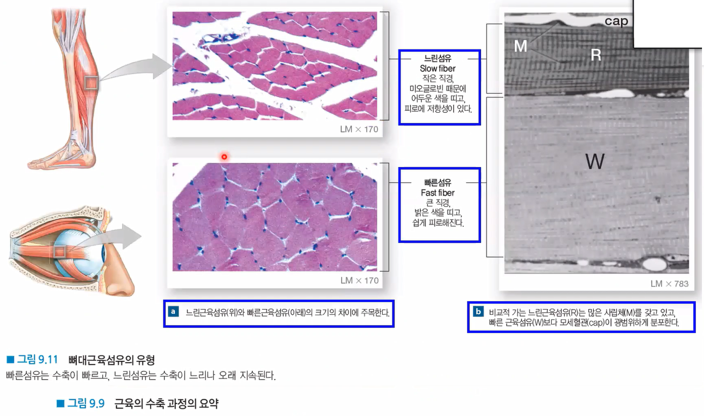 느린 섬유는 힘이 세서 산소가 많이 필요하고 때문에 미오글로빈이 많아 더 붉은 색을 띤다.