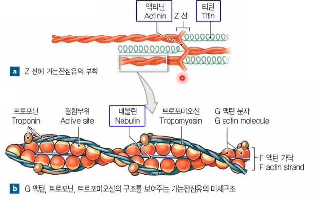 티틴은 미오신을 관통한다. 근육의 작용 기전은 생리학 파트이기때문에 이 글에서는 다루지 않는다.