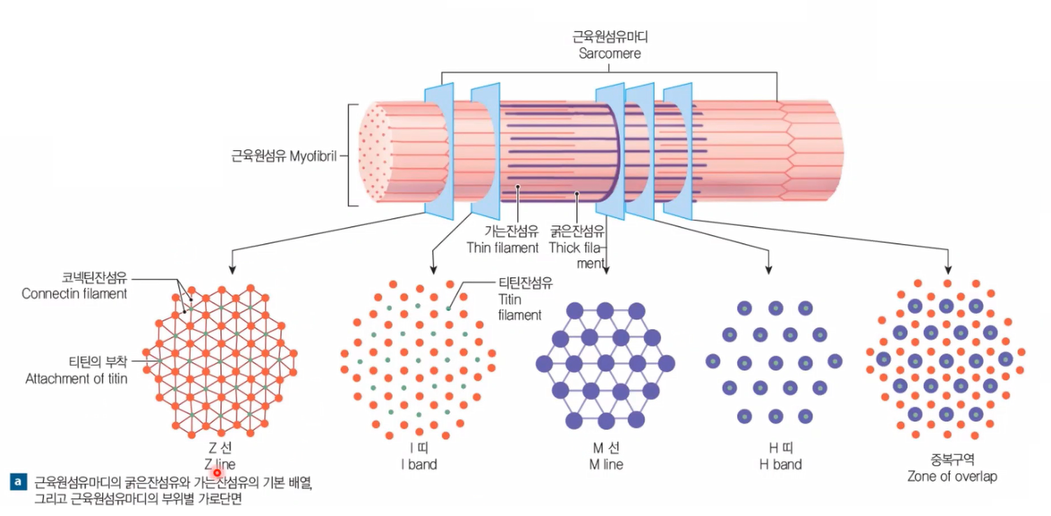 섬유마디의 각 부위별 가로 단면은 알아두면 좋다. Z선에서 보이는 connective filament이 있는데 titin을 부착시킨다. titin단백질은 I띠에서도 보인다.
